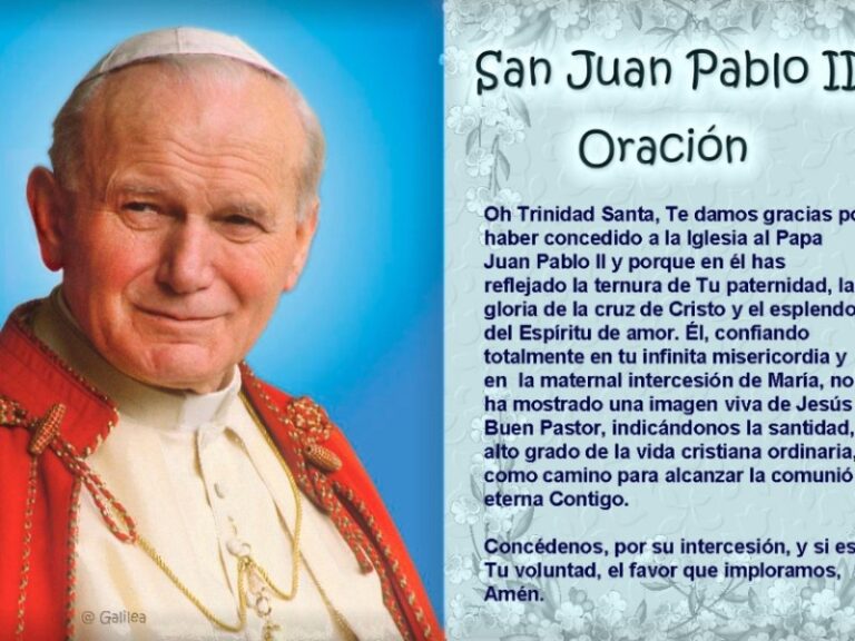 Oh, San Juan Pablo II, tú que fuiste un reflejo de la Santísima Trinidad en la tierra, te pedimos humildemente que intercedas por nosotros ante Dios. Tu vida fue un testimonio de fe, amor y servicio, y ahora, desde el cielo, sigues intercediendo por la Iglesia y el mundo. Te rogamos que nos concedas la gracia de (menciona tu petición específica), un favor que necesitamos para nuestro bien y para la gloria de Dios.
